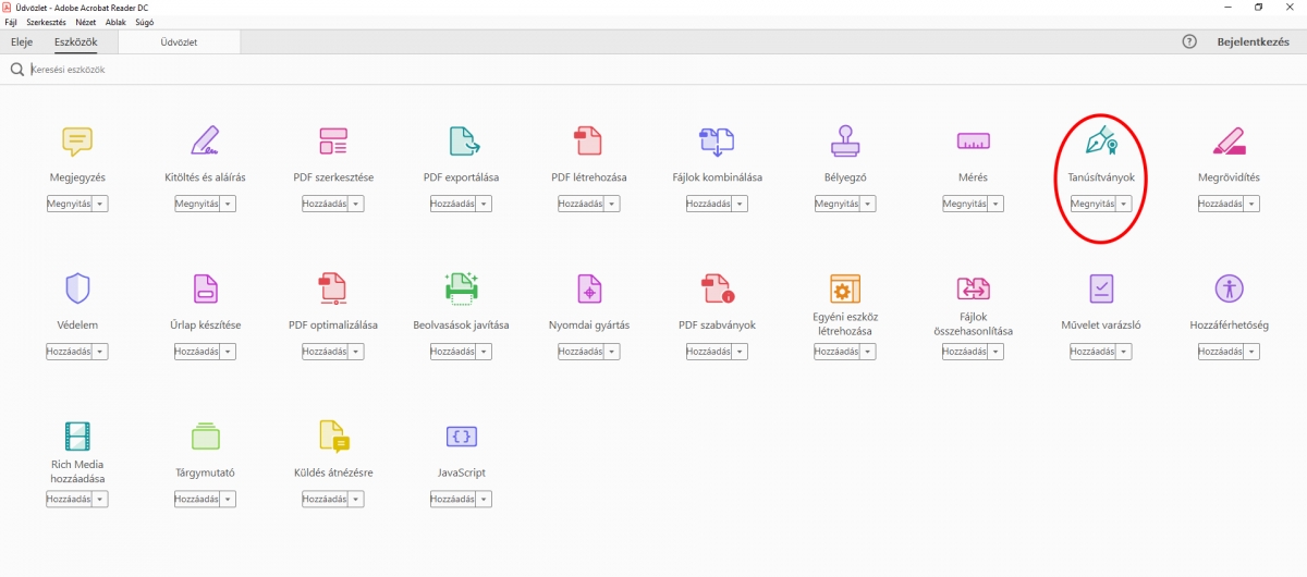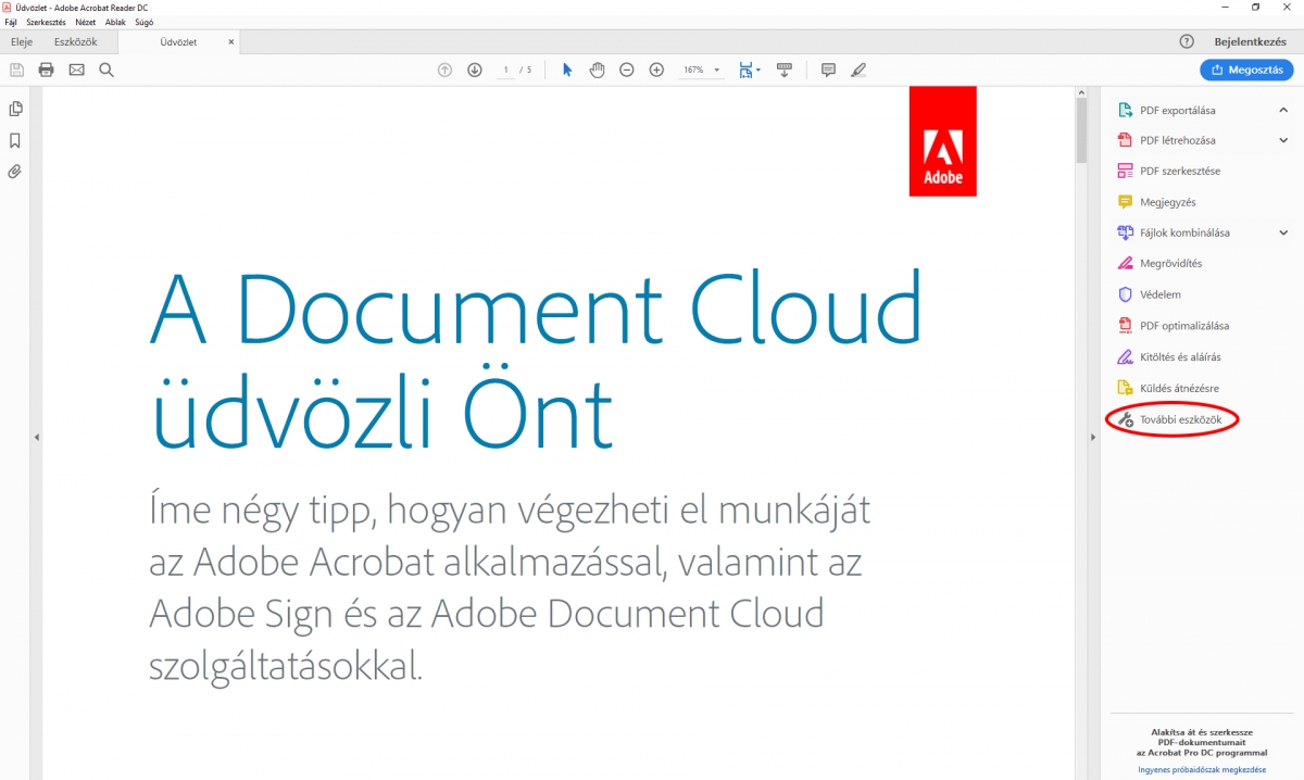 1. Nyissuk meg az Adobe Acrobat Reader programot. A programban nyissunk meg egy tetszÅ‘leges PDF fájlt és a jobb oldali panelben válasszuk ki a „További eszközök” menüpontot.