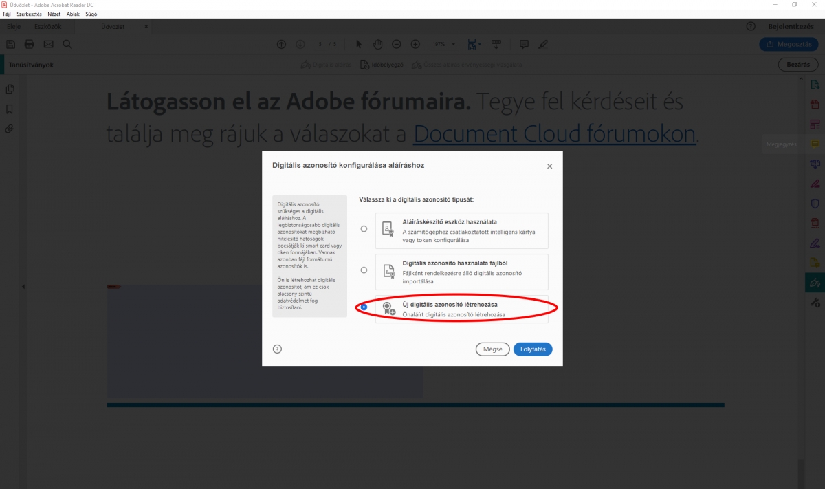6. A következÅ‘ lehetÅ‘ségnél válasszuk ki az „Új digitális azonosÃtó” létrehozását.