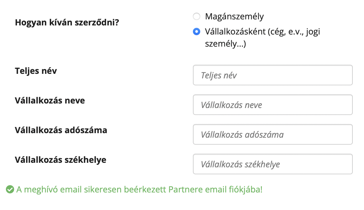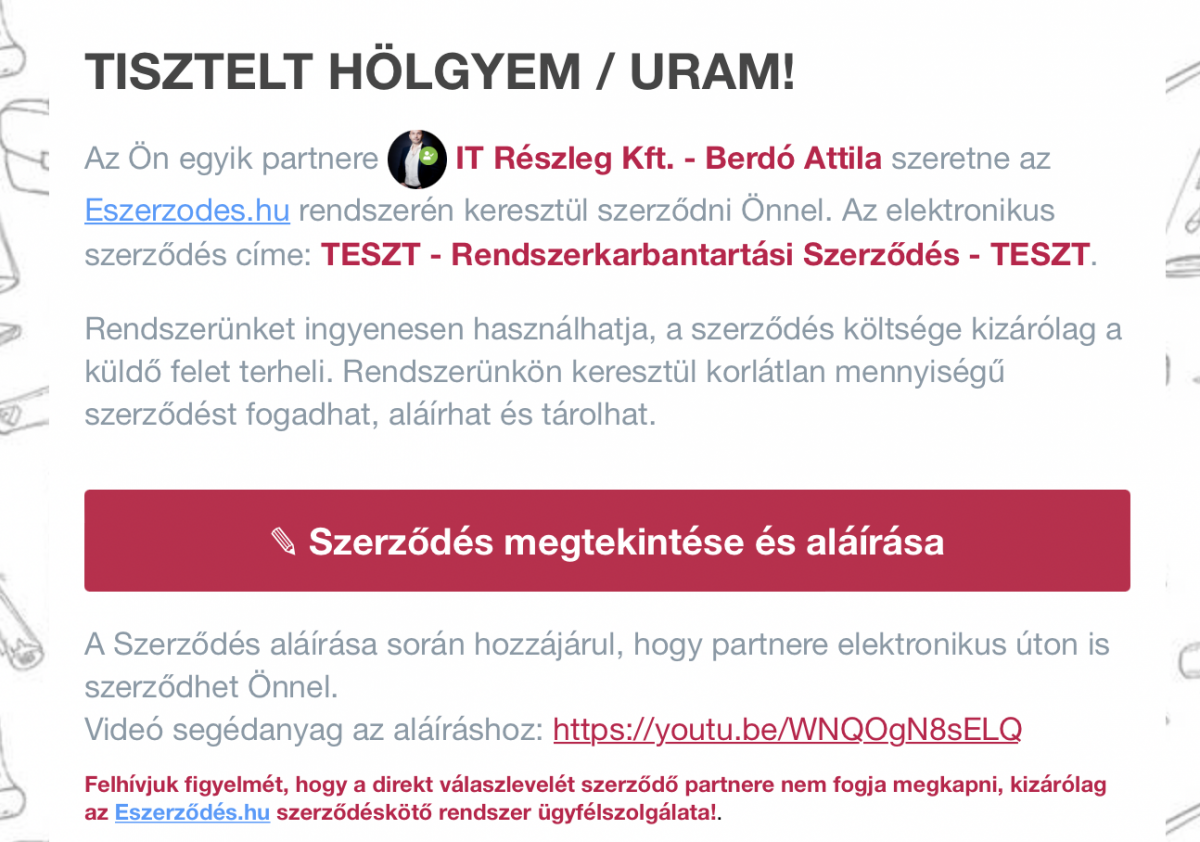 1. Ha az IT Részleg elkészült a szerzÅ‘dés tervezetével, úgy elküldjük a megadott e-mail cÃmre a meghÃvót. Amennyiben még nem volt az eszerzodes.hu-val regisztrációja a Partnernek, úgy az alábbi levél érkezik meg a postafiókba: