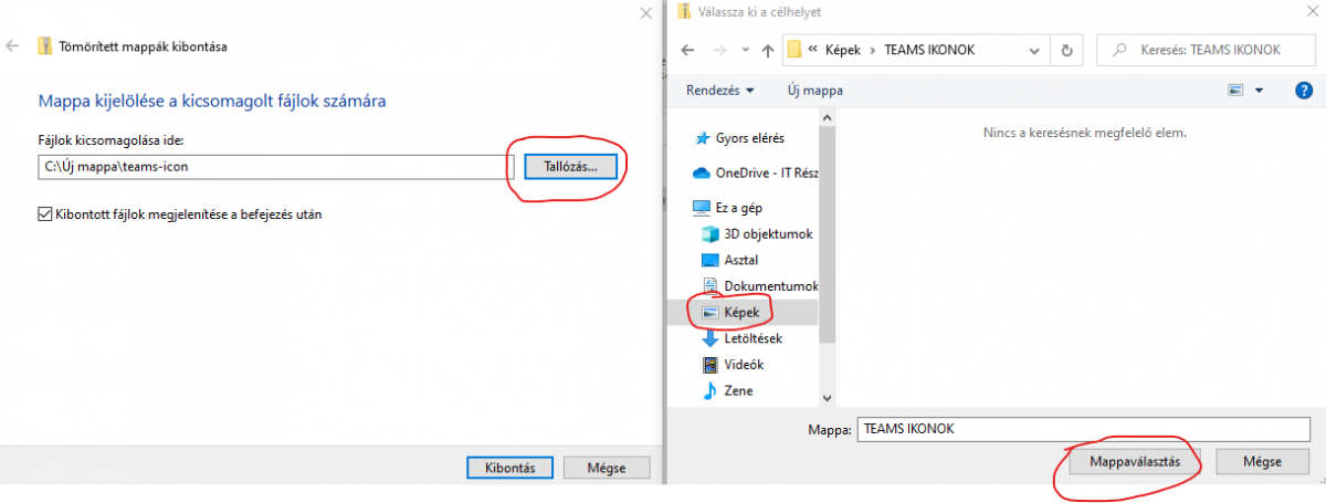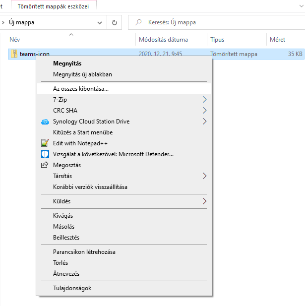 Csomagoljuk ki a zip fájl tartalmát egy mappába, pl. a „Képekbe”. Ennél a példánál készítettünk egy almappát is, TEAMS IKONOK névvel.