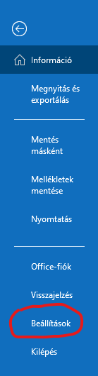 Nyissuk meg az Outlook-ot, és kattintsunk a „Fájl” menüre, ezen belül a „Beállítások”-ra.