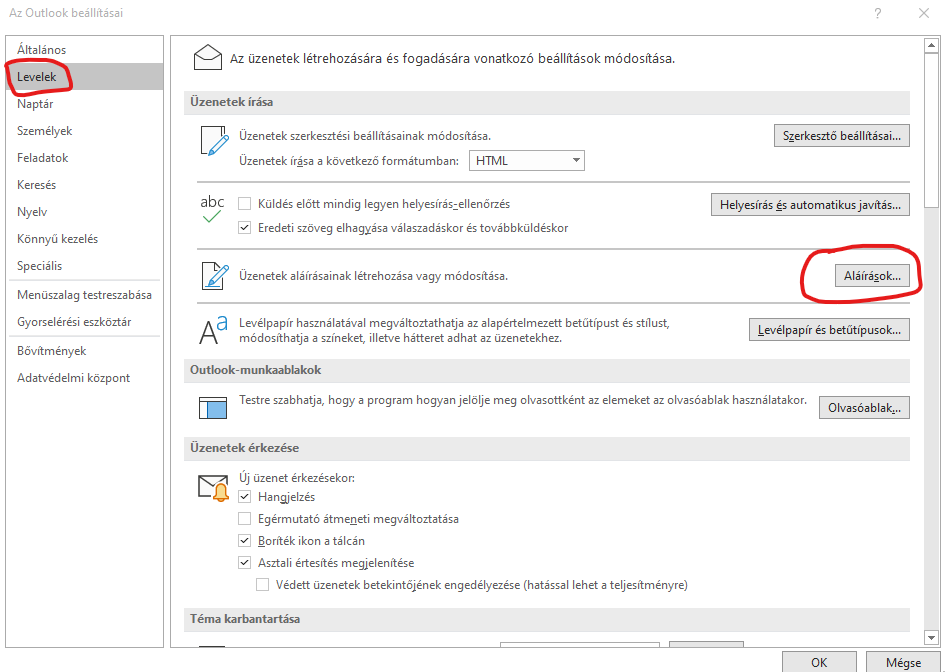 A beállításnál a „Levelek”, „Aláírások” gombra bal klikk: